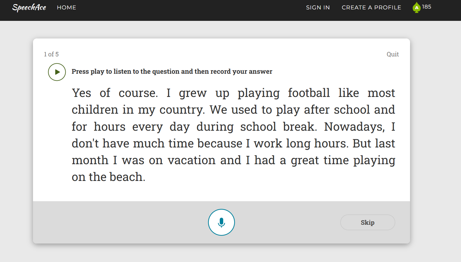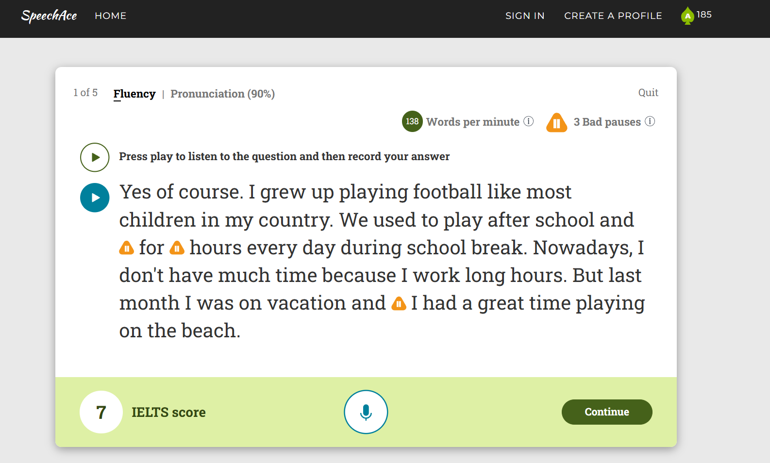 در اینجا از زبان آموز درخواست شده که میکروفن رو فعال کنه و از روی متنی که نوشته شده بخونه.(من دقیقا دنبال چنین چیزی بودم!) برای مثال من این کار رو کردم و نتیجه به شکل زیر بود:از اونجایی که این تمرین مربوط میشه به fluency صدام رو صرفا بر اساس روان بودن حس و حال جمله بررسی کرده و اینکه آیا تونستم بدون اینکه یکپارچگی کلمات در جمله رو بهم بزنم کل متن رو بخونم یا نه.اگه تصویر رو با دقت ببینید مشخصه که من سه جای جمله مکث داشتم که کمی نامطلوب واقع شده و باید اصلاح بشه در آخر هم به نحوه ادای کلماتم نمره ای اطلاق شده که تقریبا معادل 7 آیلتس بوده هرچند این به معنی این نیست که برای گرفتن نمره 7 آیلتس فقط کافیه روی fluency کار بشه داستان نمره دهی برای اسپیکینگ آیلتس کلا چیز دیگه ای هستش.در بالا سمت چپ تصویر هم میزان درست تلفظ کلمات(نه صرفا روان بودن) ارزیابی شده و به درصد عددی گزارش شده.